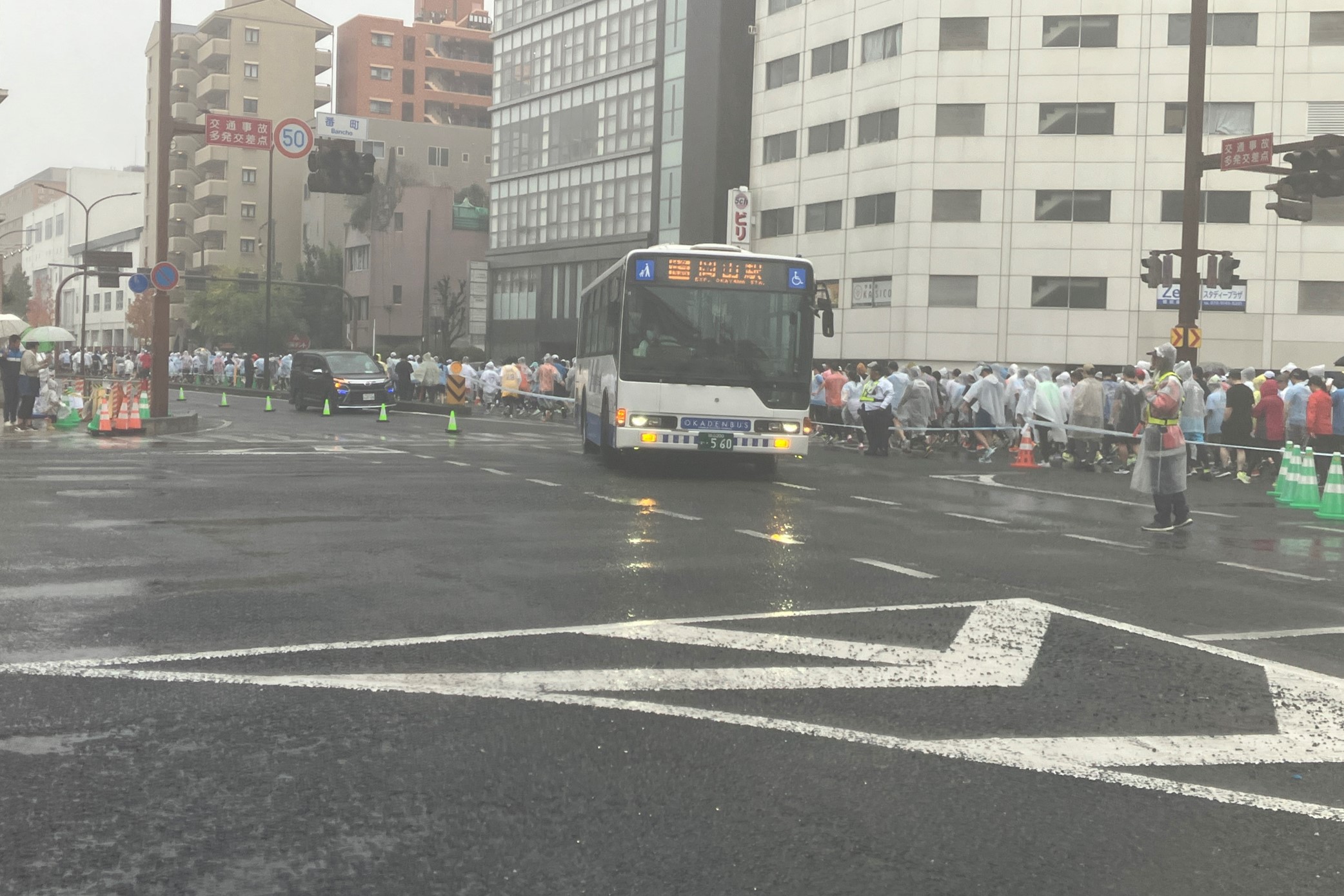 日本管財は、今年で9回警備業務を実施しており、分単位の閉鎖時刻が設けられた計11の関門などを計画通りに運営できるよう、警備計画を策定しました。雨天の中決行された大会当日は、JR岡山駅などの施設利用者とランナーの動線整理、観光客と応援者の混在対策などを行いました。