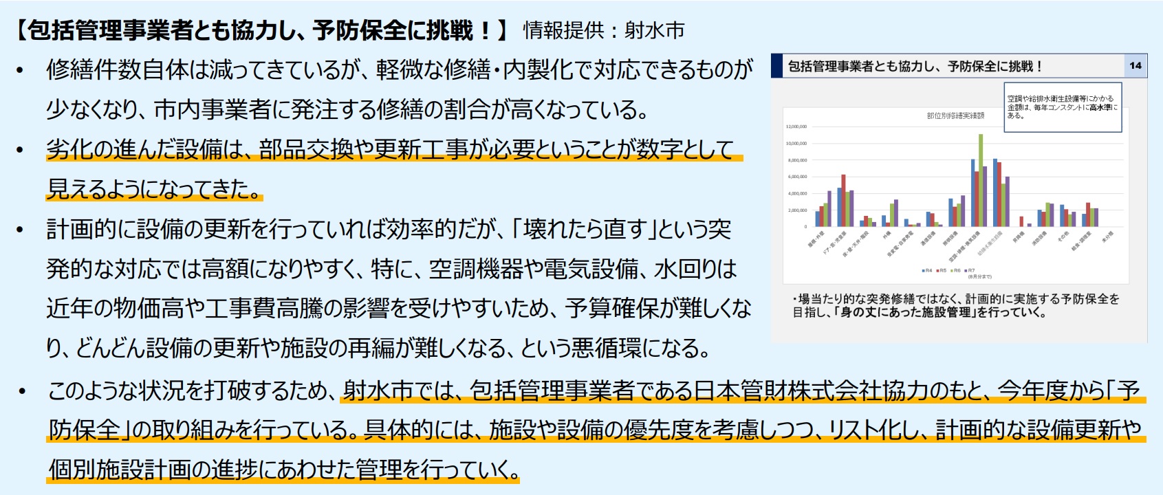 本事例は、射水市が公共施設105施設・866業務を対象に包括管理業務委託を導入し、FMの高度化と職員のコア業務集中を同時に実現した点に大きな先進性がある。