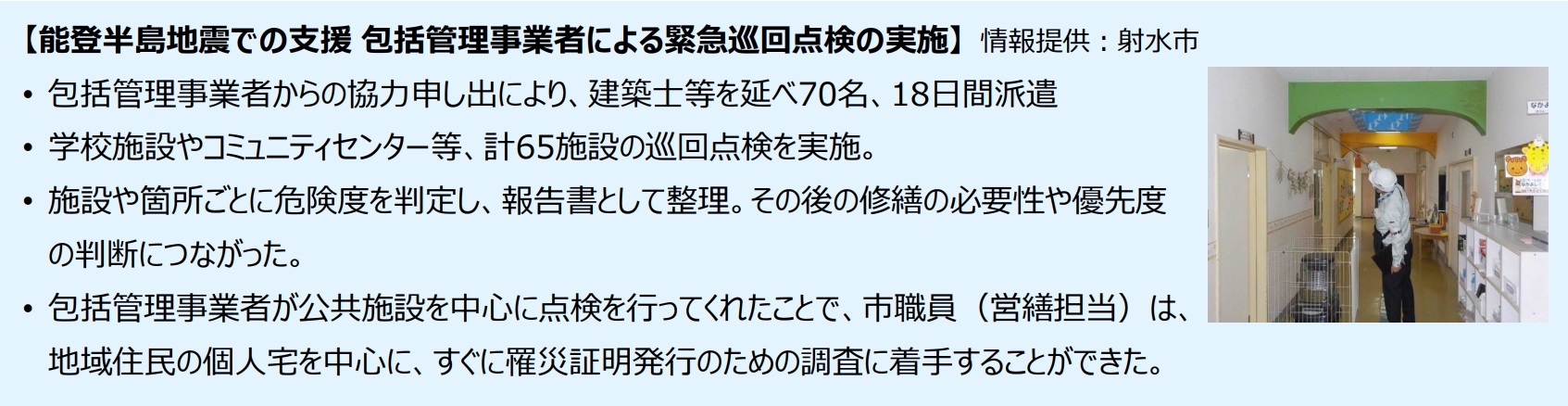 包括管理と民間提案制度を組み合わせることで、職員負担の軽減と財政支出の抑制、さらには脱炭素化や施設価値向上までを一体的に推進している点は高く評価される。能登半島地震時にも有効に機能したという実績は、制度の実効性と強靭性を示すものである。