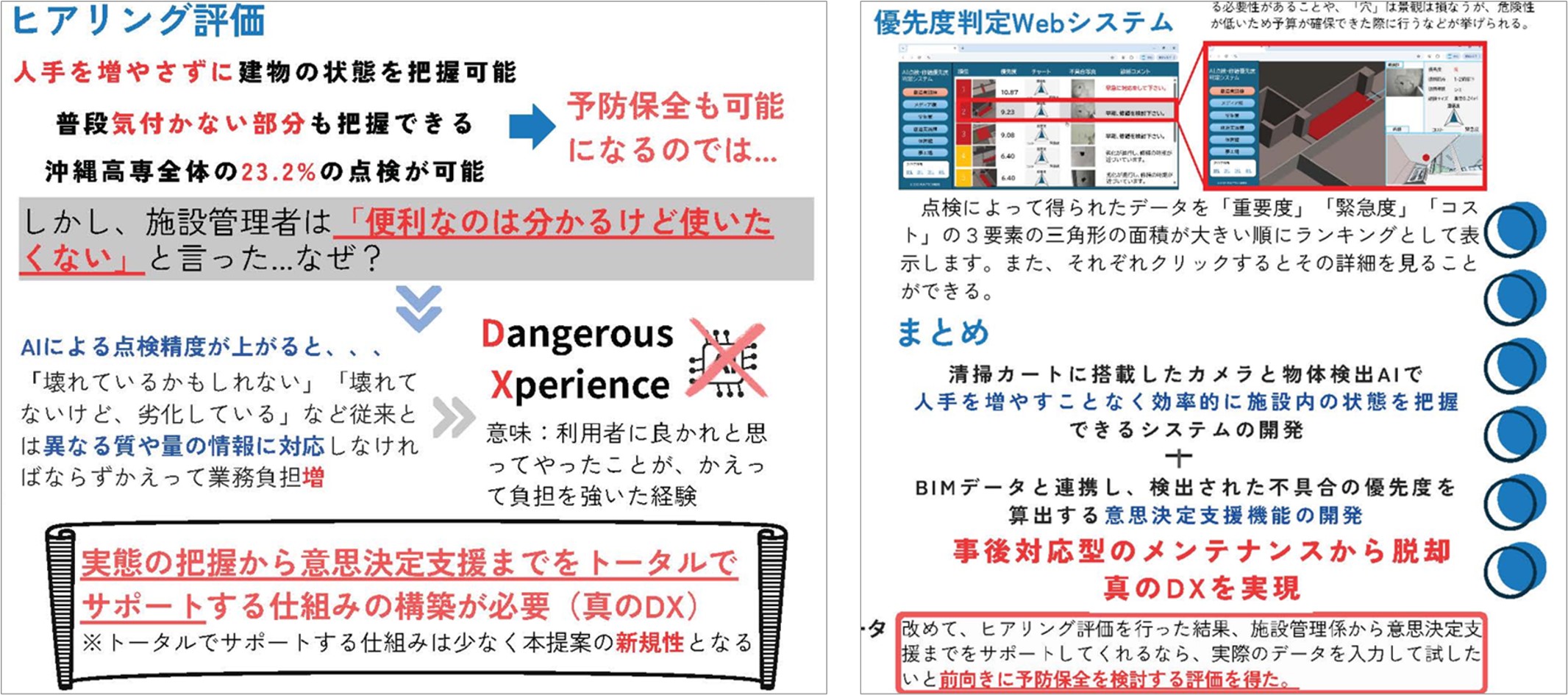 同校は日常清掃と同時に施設点検を自動化する「清掃カート搭載AI点検×BIM連携」により、校内の施設管理者が2名という実態に対し、高精度かつ負担軽減につながる仕組みを提案。施設管理者への実地ヒアリングを踏まえ、実務に適した改良策まで示した点を評価しました。