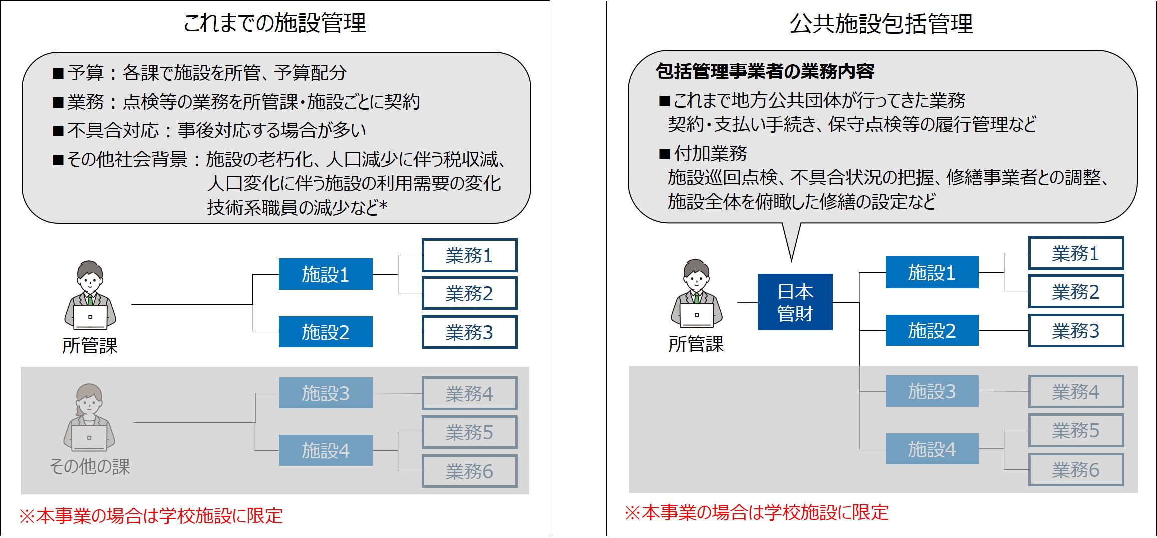 日本管財は、公共施設の包括管理を通じて、渋谷区の目指す「学校施設の維持管理水準の向上と教育環境の安定的な確保」に貢献してまいります。