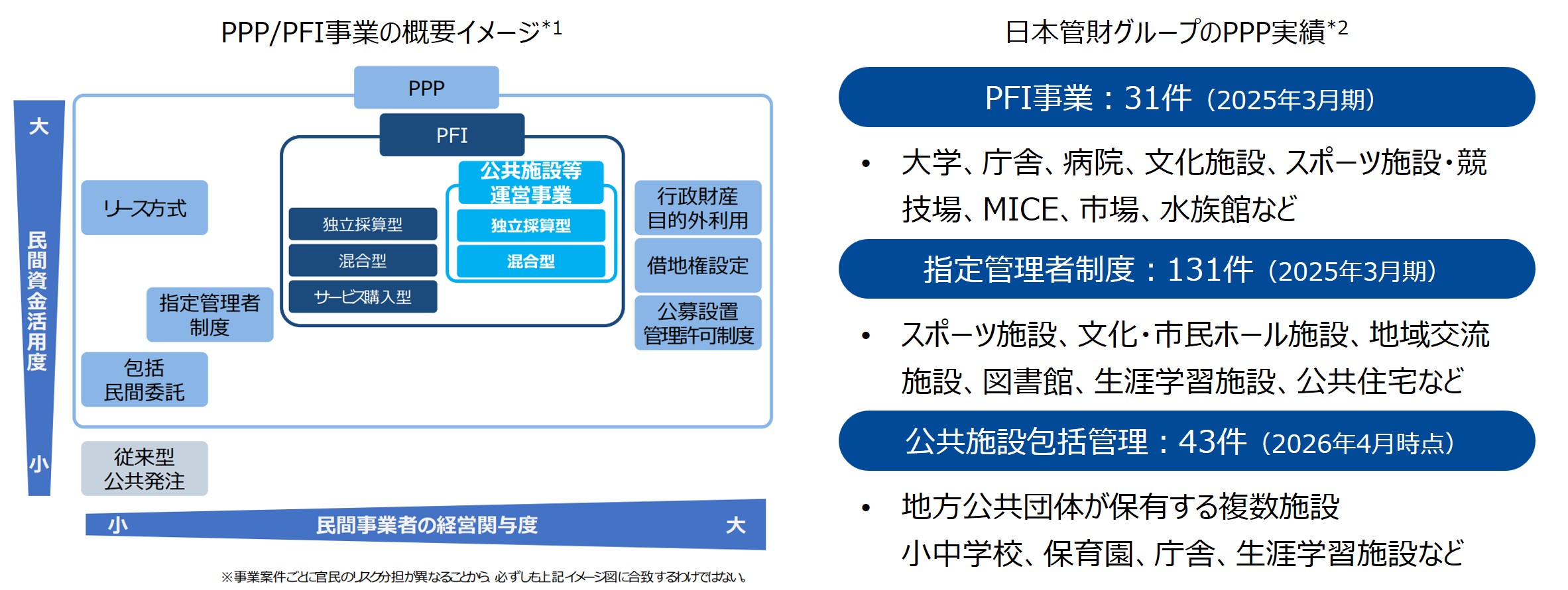 日本管財ホームページ https://www.nkanzai.co.jp/pfi-work/ 、 https://www.nkanzai.co.jp/ppp/