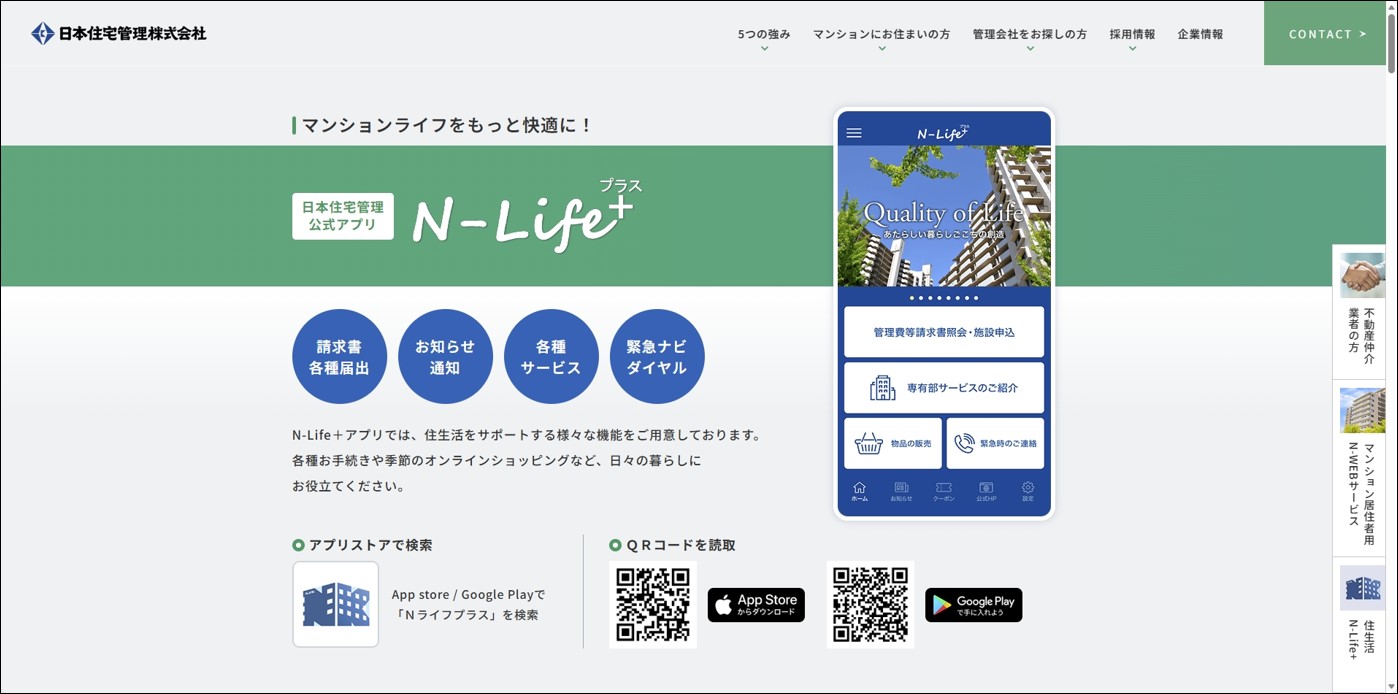 同ページでは、日本管財住宅管理および日本住宅管理が提供する、居住者向けマイページサービス「N-WEB」や、暮らしをサポートするサービス「N-Life+」をはじめとする各種サービスへの動線を整備し、日常的なお手続きやお問い合わせをより分かりやすくご案内できる構成としています。